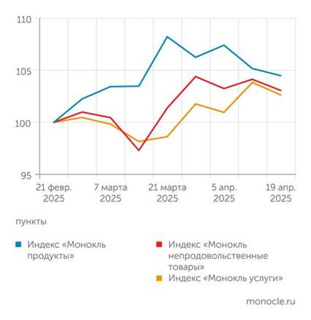 Наш эксперимент стартовал в конце февраля и длится уже полных восемь недель. Соответственно, мы рассчитали динамику индексов продовольственных и непродовольственных товаров, услуг, а также сводный показатель за этот период. За два месяца общий ценовой индекс «Монокля» увеличился на 3,47%, то есть наблюдаемая нами инфляция составляет около 21% годовых. Быстрее прочего повышаются цены на продукты: индекс «Монокль продукты» взлетел на 4,48% (почти 27% годовых). «Монокль непродовольственные товары» рос не так быстро, прибавив за два месяца 3,06% (около 18% годовых). Индекс «Монокль услуги» поднялся всего на 2,63% (около 16% годовых). Возможно, дело в выбранной корзине, и в перспективе динамика индексов будет более показательной.