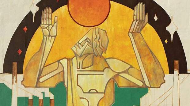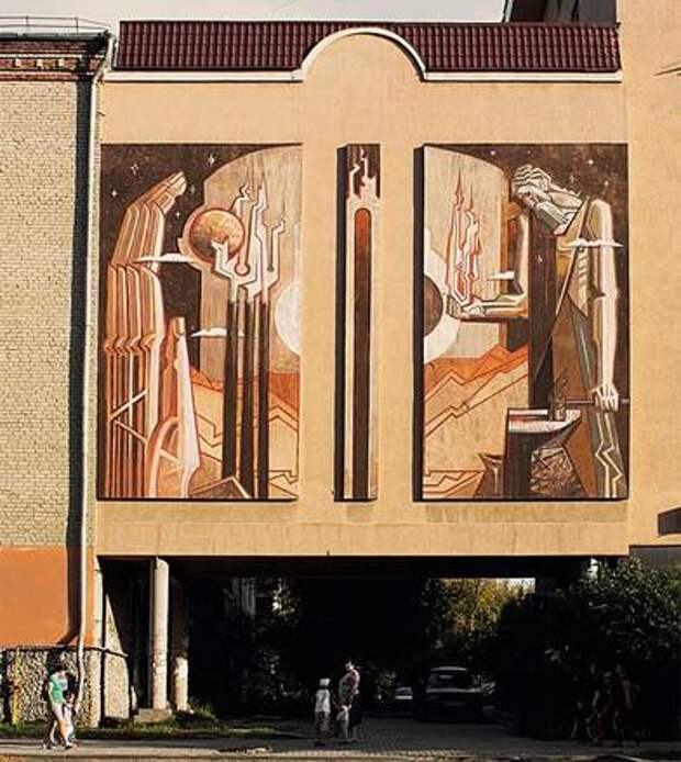 В Екатеринбурге я сначала работал на «Уралмаше». Это был Гефест, бог-кузнец. Сюжет диктовал сам индустриальный пейзаж и дух этого брутального района города — там были интересные сочетания плит и ритмика труб. Сюжет часто образуется интуитивно: видишь место, возникает ассоциативный ряд. В этой работе я сочетал греческую, античную мифологию с какими-то элементами индустриального мира и стилистикой конструктивизма.