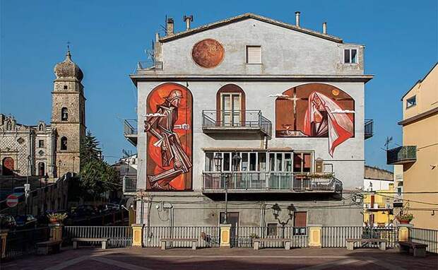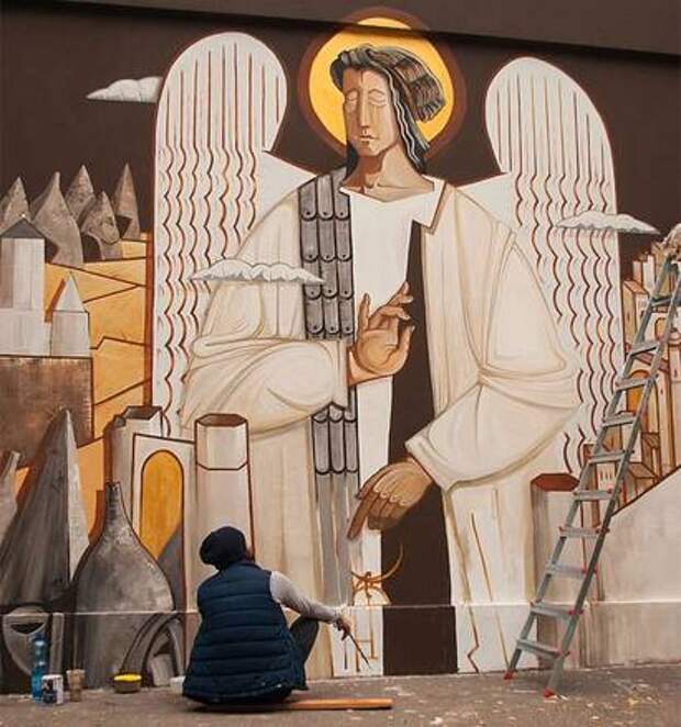 — Но я бы не сказал, что муралы выполнены в православной стилистике, хотя я работаю и над библейскими сюжетами. Скорее это отсылки к христианству в общем смысле, включая европейскую традицию. Можно сказать, что православные художники наследуют русскую традицию иконописи, а это делает их более понятными внутри страны, в то время как я использую более европейский подход, делающий понимание и узнавание универсальным, не зависящим от границ и национальностей. Когда мы возили эти работы на выставки, европейцам становилась понятна и наша культура, и в то же время им привычен и понятен сам художественный язык — получается очень интересный синтез.