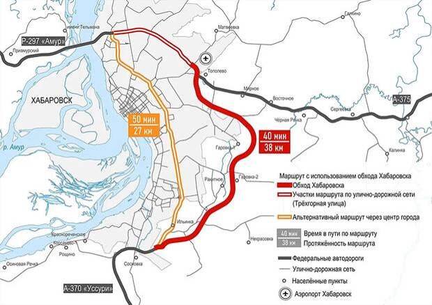 Кроме того, проект не смог обеспечить пользователям значительную экономию времени в пути — она составляет порядка 7‒10 минут по сравнению с бесплатным маршрутом через город. Во-первых, новая платная дорога длиннее (см. карту). А во-вторых, обход Хабаровска непосредственно не соединяет северный и южный выезды из города. Для того чтобы попасть с трассы Р-297 «Амур» на скоростную дорогу, необходимо сначала въехать на улично-дорожную сеть — улицу Трехгорная, которая славится своими пробками, вследствие чего время в пути по платному маршруту может оказаться даже выше, чем при проезде через центр города. В результате хабаровчане предпочитают не переплачивать, так как все равно придется стоять в пробке на подъезде к скоростному участку.