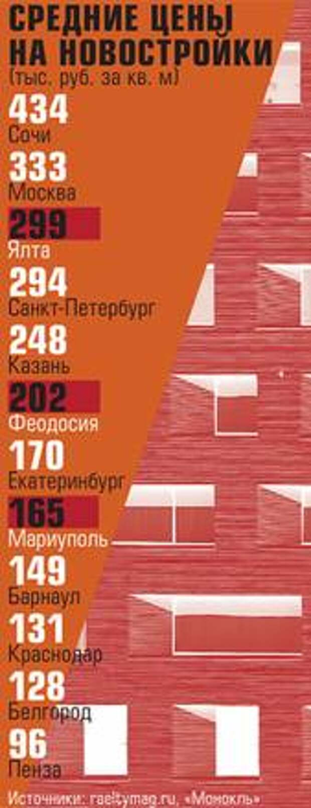 По данным компании bnmap.pro, средняя цена квадратного метра крымских новостроек за год увеличилась на 36% — с 196 тыс. до 266 тыс. рублей. Несмотря на этот рост, Крым значительно дешевле Сочи, где, по данным компании «Оникс-недвижимость», средняя цена «квадрата» в новостройке сейчас составляет 476 тыс. рублей.