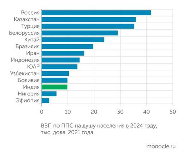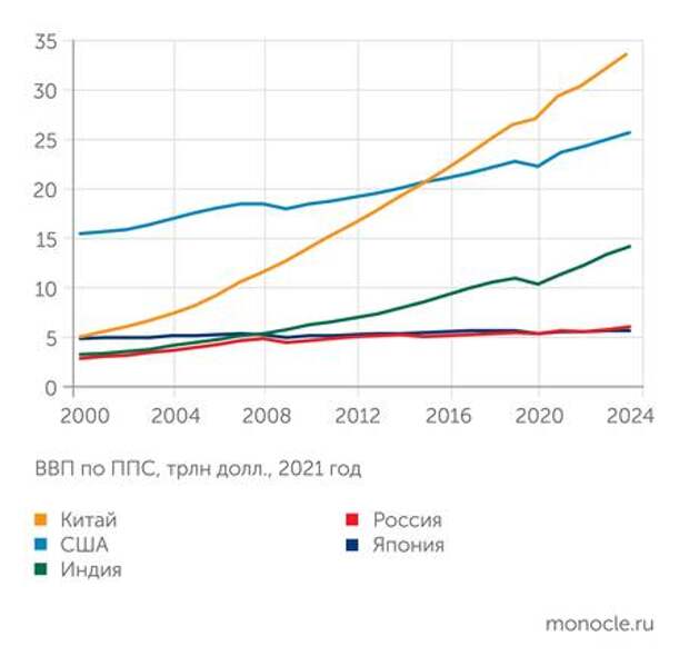 В первой четверти XXI века экономика Индии росла быстро (6,3% в год), но все же существенно медленнее, чем китайская (8,1% в год). В результате разрыв в масштабах хозяйства двух азиатских гигантов нарастал. Если в 2000 году Китай превосходил Индию в 1,6 раза, то в прошлом году гандикап увеличился до 2,4 раза. Однако в постковидный период Китай стал резко тормозить, а Индия, напротив, демонстрирует ускорение: руководство страны ставит задачу повысить темпы экономического роста до ежегодных 8%. Если они будут достигнуты и выдержаны на протяжении второй четверти нынешнего века, то к столетию независимости Индии от британской короны, в 2047 году, она имеет шанс сравняться по масштабу экономики (ВВП по ППС) с Китаем — если его темпы роста упадут до 4% в год