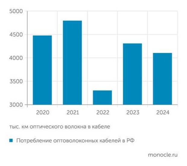 После начала СВО спрос на кабели в РФ сначала резко упал, но в последние два года стал постепенно восстанавливаться. По данным аналитической компании SRG, если в 2021 году в стране было зафиксировано потребление около 4,8 млн километров оптического волок на в кабеле, то в 2022-м этот показатель рухнул более чем на четверть, до 3,3 млн. Но в 2023 году рынок взлетел до отметки 4,3 млн, а в 2024-м незначительно снизился — до 4,1 млн (см. график 2).