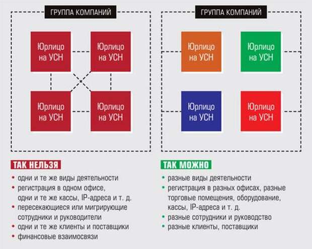 Например, доказать отсутствие дробления помогает довольно стандартный набор аргументов: наличие собственных материальных, производственных, трудовых ресурсов; самостоятельное несение расходов каждым участником группы (то есть каждая компания сама оплачивает свои хозяйственные и прочие нужды, от туалетной бумаги до оплаты поставщикам товарно-материальных ценностей), отсутствие «кругового» финансирования, когда за счет одной компании финансируются другие и устанавливается круговое движение денежных средств в группе; наличие сторонних заказчиков и поставщиков.