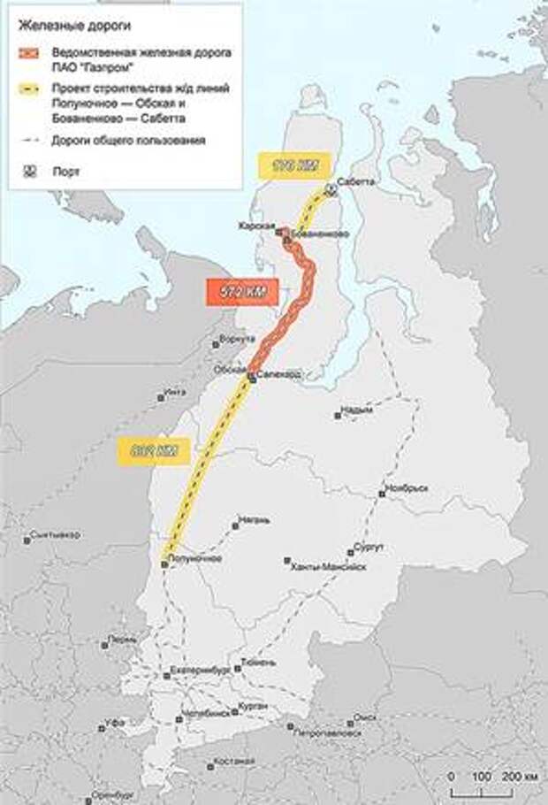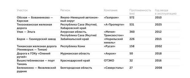 километров железных дорог необщего пользования. Их владельцы — около 2000 компаний. Среди путей необщего пользования можно выделить несколько крупных линий, которые обеспечивают вывоз грузов разных компаний, имеют широкий стандарт колеи (1520 мм) и достаточно высокий уровень провозной способности (более 5 млн тонн в год):Обская — Бованенково — Карская (ЯНАО). 572 км. Обеспечивает работу Бованенковского нефтегазоконденсатного месторождения;