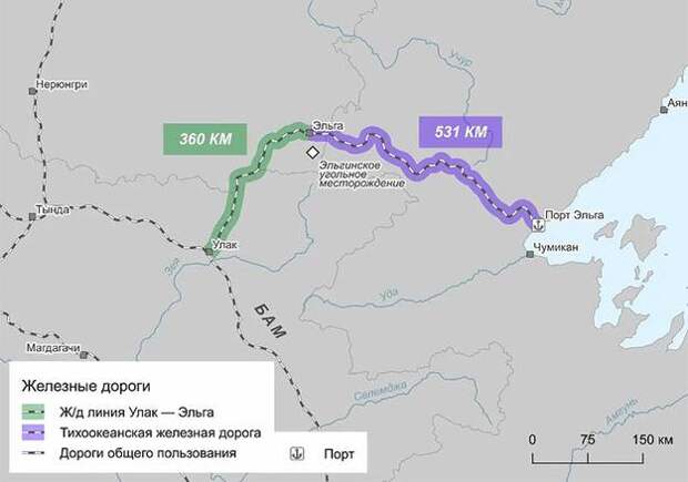 Протяженность новой магистрали — около 530 километров. Она тянется от Эльги через горные долины и плато Якутии к побережью Охотского моря, где строится порт Эльга — глубоководный терминал, способный принимать суда дедвейтом до 210 тыс. тонн. Тихоокеанская железная дорога стала одним из крупнейших частных инфраструктурных проектов в современной России. В ее реализацию вложено более 150 млрд рублей, сегодня по ней идут первые промышленные составы. Уже к концу 2025 года дорога и порт смогут работать в синхронном режиме. На первом этапе провозная способность железнодорожной инфраструктуры составляет 30 млн тонн с возможностью расширения до 50 млн тонн.