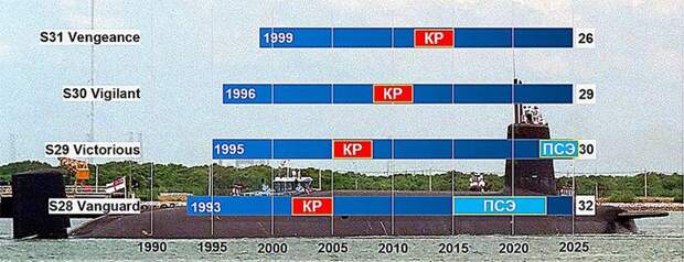 В этих целях головная S28 Vanguard в период с декабря 2015-го по май 2023 года (семь с половиной лет!) в заводских условиях подверглась работам по продлению срока эксплуатации (ПСЭ). По данным британских СМИ столь длительное время потребовалось в связи с тем, что еще в январе 2012 года в охлаждающей воде испытательного реактора PWR2 в Даунрее была обнаружена радиация, вызванная микроскопической трещиной в защитной оболочке топлива.