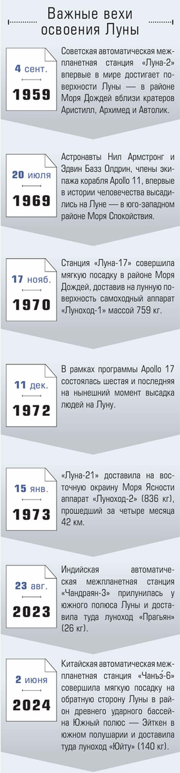 Этим летом стало известно, что Совет РАН по космосу разрабатывает программу научного освоения Луны до 2060 года. «В соответствии с текущими планами орбитальную станцию “Луна-26” запустят в 2028 году. Ее главная задача — выбрать подходящие посадочные площадки. Затем, в 2029 и 2030 годах, на южный и северный полюсы спутника будут направлены посадочные модули “Луна-27.1” и “Луна-27.2”. Еще через три-четыре года состоится миссия “Луна-28”, которая доставит на Землю образцы реголита. Предполагается также запустить орбитальную станцию “Луна-29”; помимо исследований, она будет выполнять функции ретранслятора. В 2035–2036 годах к спутнику отправят “Луну-30” с тяжелым луноходом для длительных научных изысканий», — сообщает президент РАН Геннадий Красников.