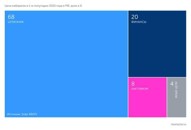 По сведениям ИБ-компании Solar 4RAYS, в первом полугодии 2025 года большая часть (68%) расследований пришлась на атаки с целью шпионажа, что на 7 п. п. больше, чем в первом полугодии 2024-го. Доля вредоносной активности, направленной на вымогательство или майнинг криптовалют, выросла на 8 п. п. год к году, до 20%. А вот количество атак «хактивистов», действующих с целью привлечения внимания (включая уничтожение инфраструктуры и публикацию украденных баз данных), сократилось на 4 п. п., до 8%. Для сравнения: еще в 2023 году этот показатель достигал 35% (см. график 1). По мнению экспертов Solar 4RAYS, такая статистика говорит о смене целей хакеров. Теперь они заинтересованы не столько в громких кейсах, а сколько в получении денежных средств и ценной информации о деятельности ведущих российских организаций.