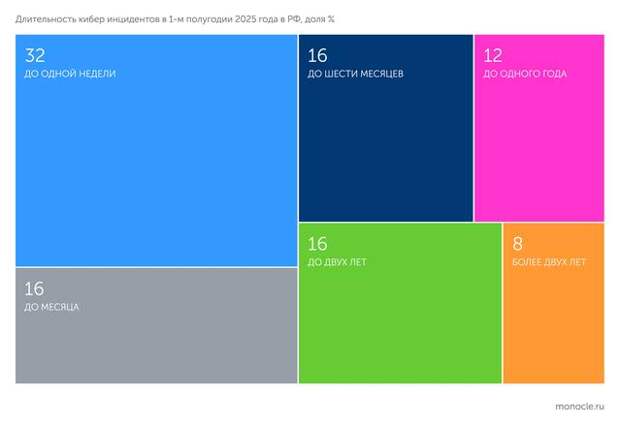 Кроме того, выросла длительность киберинцидентов. В этом году доля онлайн-атак продолжительностью до одной недели составила 32% (в прошлом году — 38%); доля атак длительностью до месяца увеличилась почти вдвое, до 16%, а время еще 16% инцидентов превышает два года (см. график 2). При этом, по данным BI.ZONE, в первом полугодии 2025 года наибольшее число кибератак с целью разведки было совершено именно в отношении российского ретейла. На втором месте медиа, на третьем — ИТ и телекоммуникационная отрасль.