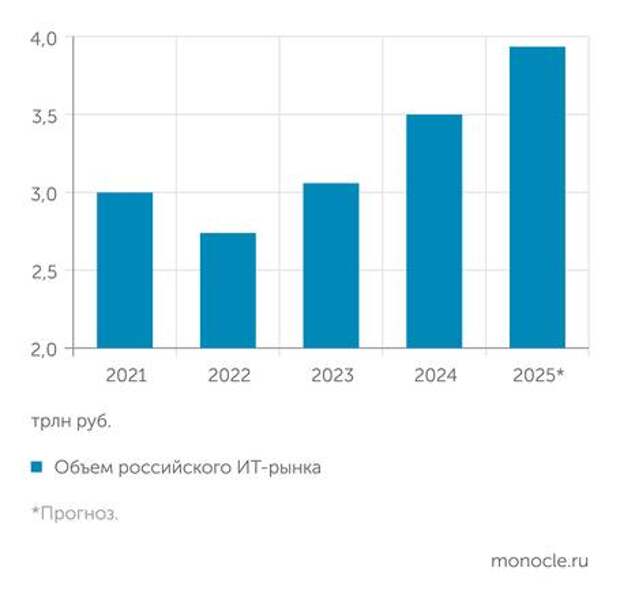 В целом последние три года российская ИТ-сфера динамично развивается. Да, сразу после начала СВО и ухода производителей из недружественных стран рынок существенно просел: по данным Strategy Partners, с отметки 3 трлн рублей в год он сократился до 2,74 трлн. Однако в 2023 и 2024 годах начался рост: по итогам прошлого года сектор расширился на 14%, до 3,5 трлн рублей. А в этом году ожидается, что рынок вырастет еще на 12%, достигнув 3,93 трлн (см. график 1).