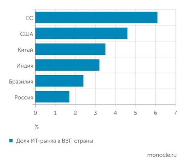 Аналитики указывают, что отечественная ИТ-отрасль имеет большой потенциал для роста. Хотя пока она сильно уступает странам — лидерам мировой индустрии как в абсолютных показателях, так и в доле от ВВП. В долларовом выражении в прошлом году ИТ-рынок достиг 37 млрд — это в полтора раза с лишним раза меньше, чем в Бразилии (52 млрд долларов), втрое меньше, чем в Индии (125 млрд), не говоря уже о Китае (648 млрд) и США (1,35 трлн). При этом, по данным Strategy Partners, доля ИТ-сферы в ВВП России оценивается в 1,7%, в то время как в Бразилии этот показатель равен 2,4%, в Индии — 3,2%, в Китае — 3,5%, в США — 4,6%, в ЕС — 6,1% (см. график 2).