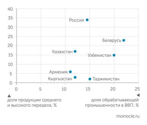 Для понимания позиций: доля всей обрабатывающей промышленности в ВВП России сегодня около 14%. Этот показатель ниже, чем в Таджикистане (16,2%). А такие «промышленно развитые» страны, как Узбекистан (20%) и Белоруссия (28%) заметно опережают Россию по доле обработки в экономике.