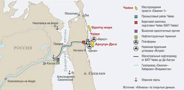 В рамках проекта «Сахалин-1» разрабатываются три нефтегазовых месторождения — Чайво, Одопту и Аркутун-Даги — на шельфе Охотского моря у северо-восточной оконечности острова Сахалин. Общие запасы месторождений проекта оцениваются в 307 млн тонн нефти и 485 млрд кубометров природного газа.