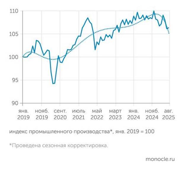 В обрабатывающих производствах, которые были локомотивом посткризисного восстановления всей промышленности, подъем в середине 2024 года остановился, а с начала текущего года здесь в целом наблюдается заметный спад.